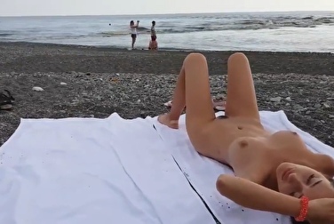 Сочная нудистка с силиконовыми сиськами мастурбирует на пляже